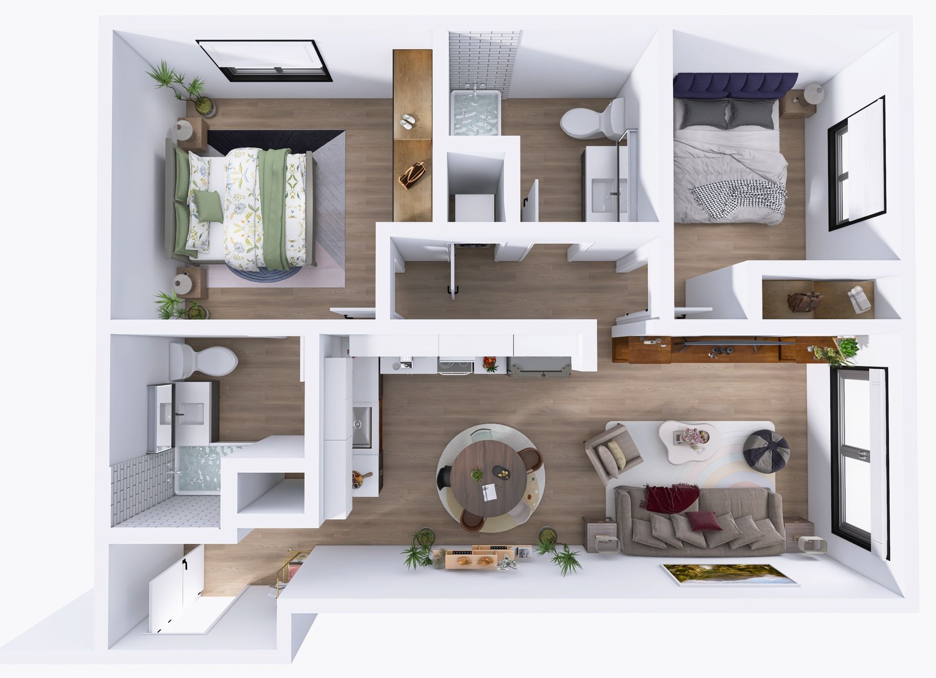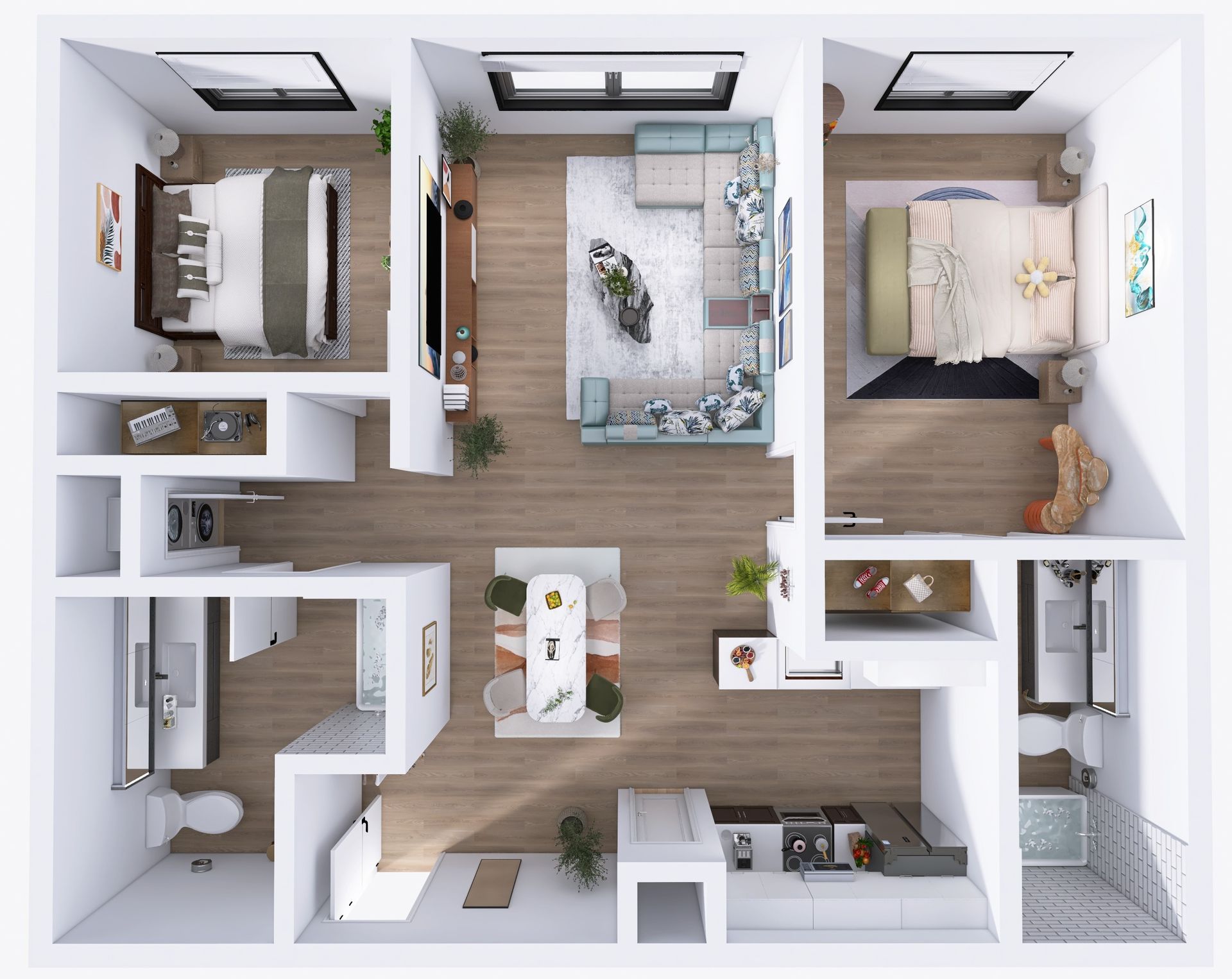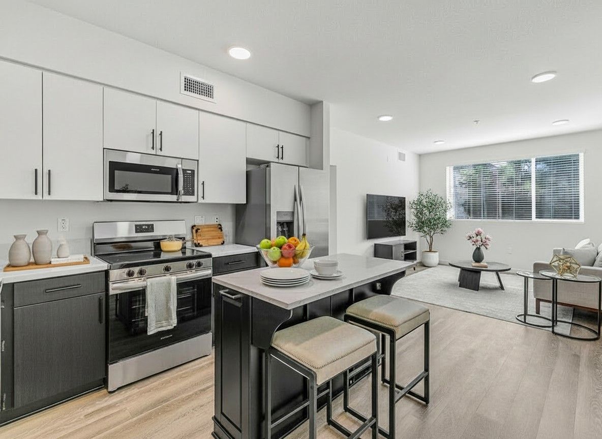 Enter your new home to discover high-end kitchens featuring full-size stainless steel appliances, in-unit washer/dryer, open-concept layouts seamlessly connecting kitchens and living rooms, and built-in linen cabinets for added storage.