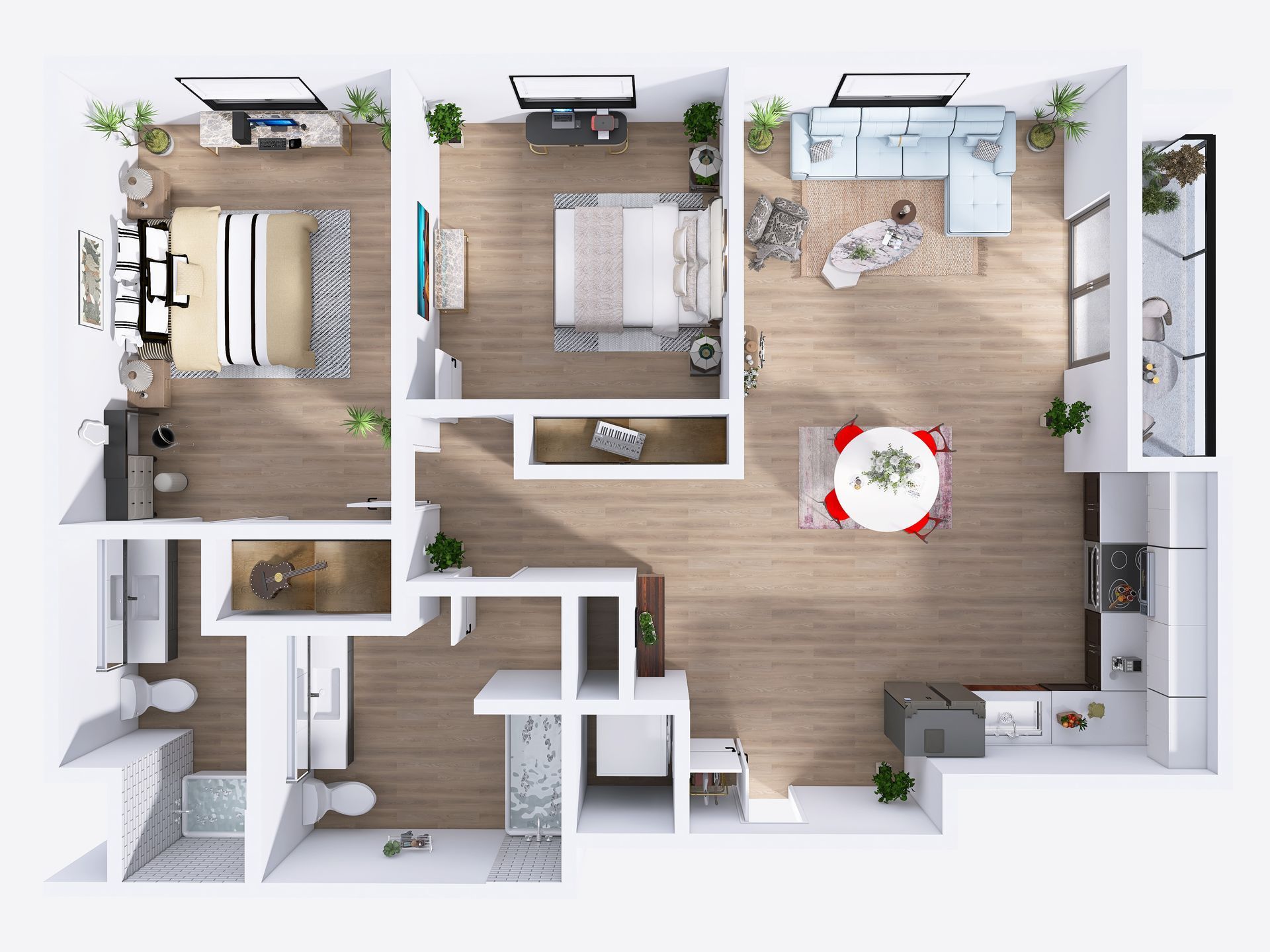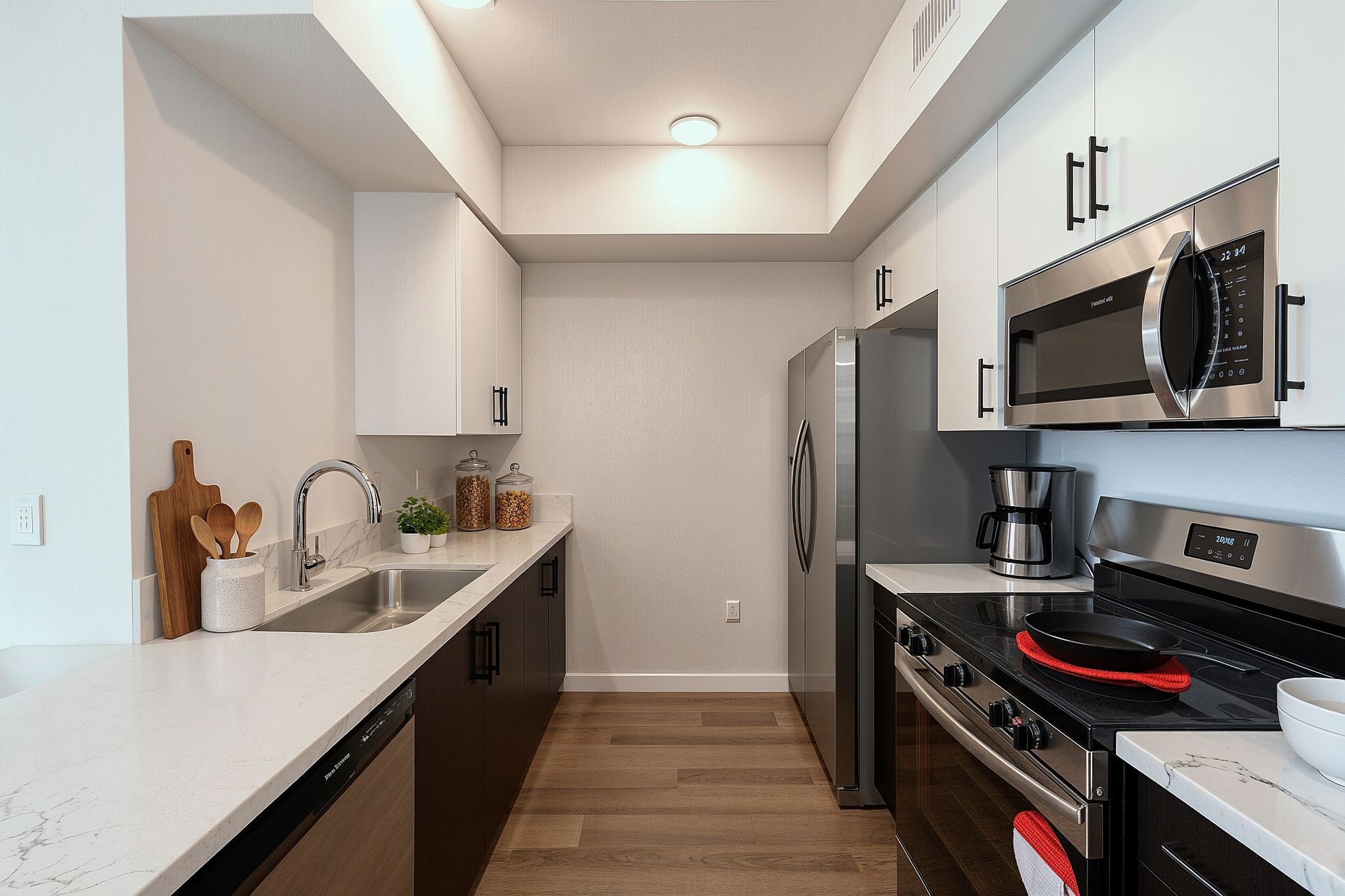 Our floor plans boast expansive interiors flooded with natural light streaming through large windows. Enter your new home to discover high-end kitchens featuring full-size stainless steel appliances, in-unit washer/dryer, open-concept layouts seamlessly connecting kitchens and living rooms, and built-in linen cabinets for added storage.