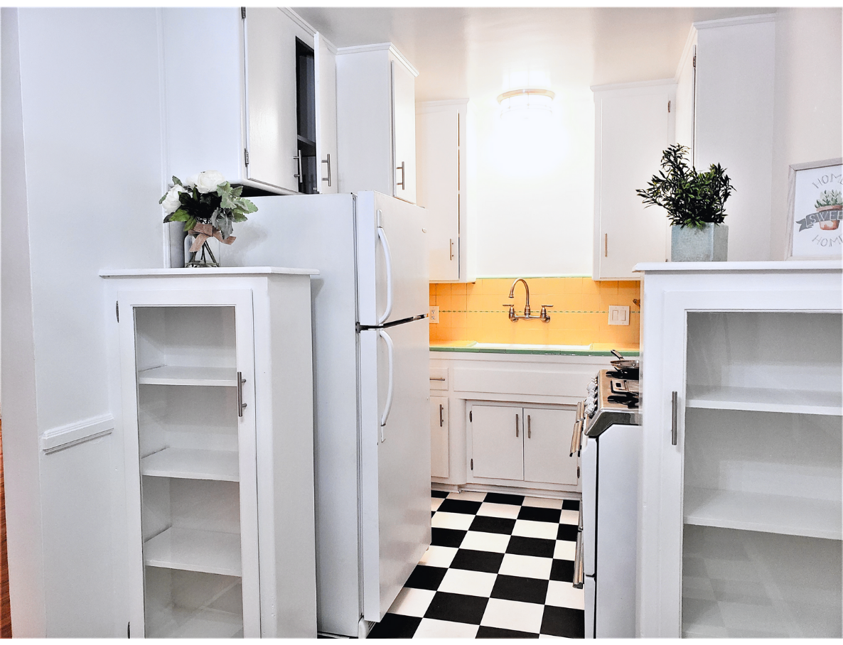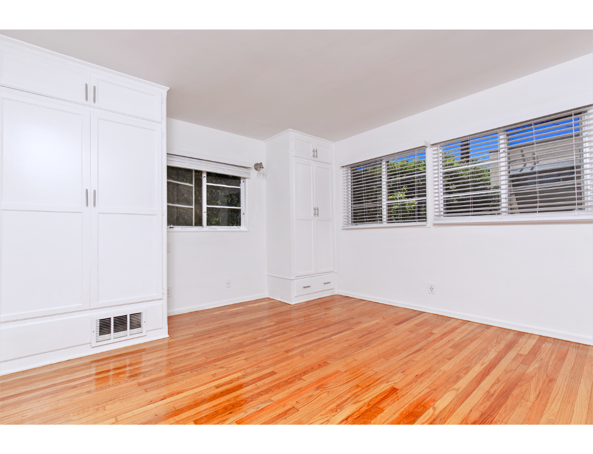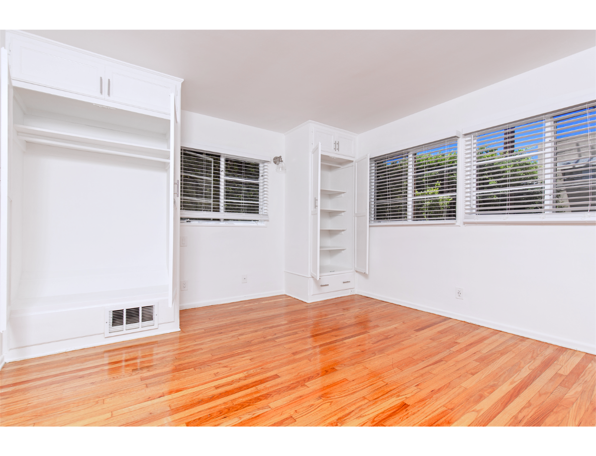 This updated vintage-style unit is beyond charming and cute! Unit boasts with a large and spacious living room that leads to a hallway with huge storage space, bathroom with bathtub, and shower cab. Also leading to a beautiful and bright bedroom with built-in closet spaces and lots of natural light. Plus no shared walls! On the opposite side of the unit, we enter the master bedroom with curved art deco style windows, a large closet, and a private bathroom. Enjoy the master bedroom view that looks out to our beautiful lushly landscaped courtyard. The kitchen is brightly colored with original tiles, vintage O'Keefe & Merrit stove, lots of cabinet space, and glass antique cabinets.