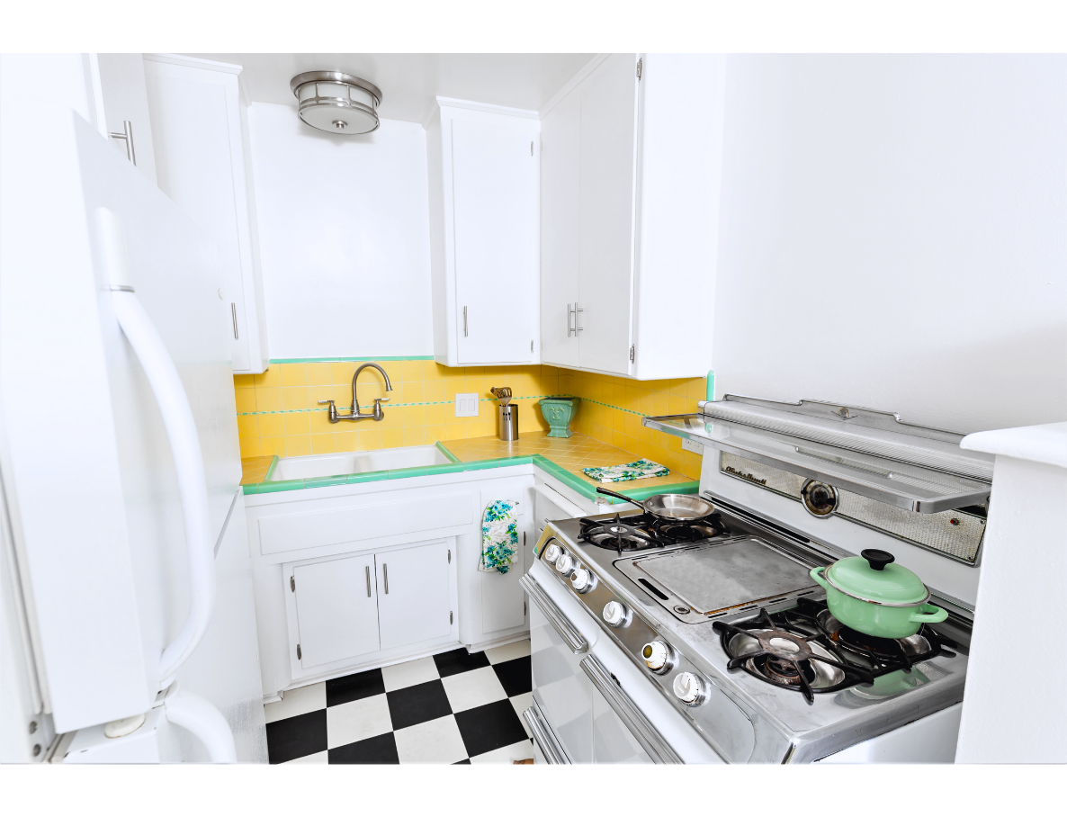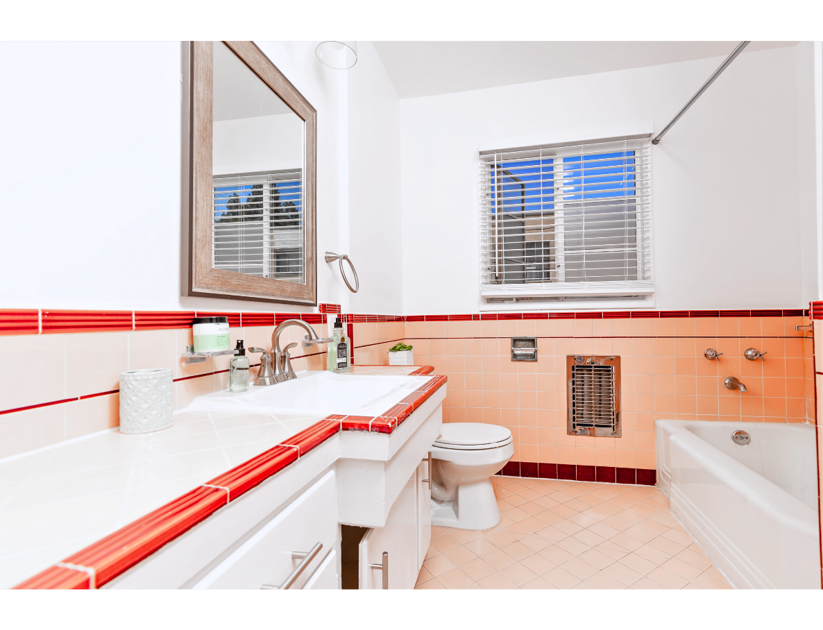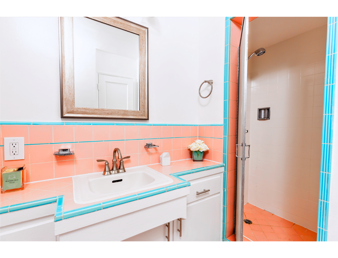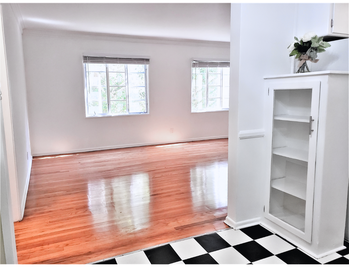 This updated vintage-style unit is beyond charming and cute! Unit boasts with a large and spacious living room that leads to a hallway with huge storage space, bathroom with bathtub, and shower cab. Also leading to a beautiful and bright bedroom with built-in closet spaces and lots of natural light. Plus no shared walls! On the opposite side of the unit, we enter the master bedroom with curved art deco style windows, a large closet, and a private bathroom. Enjoy the master bedroom view that looks out to our beautiful lushly landscaped courtyard. The kitchen is brightly colored with original tiles, vintage O'Keefe & Merrit stove, lots of cabinet space, and glass antique cabinets.