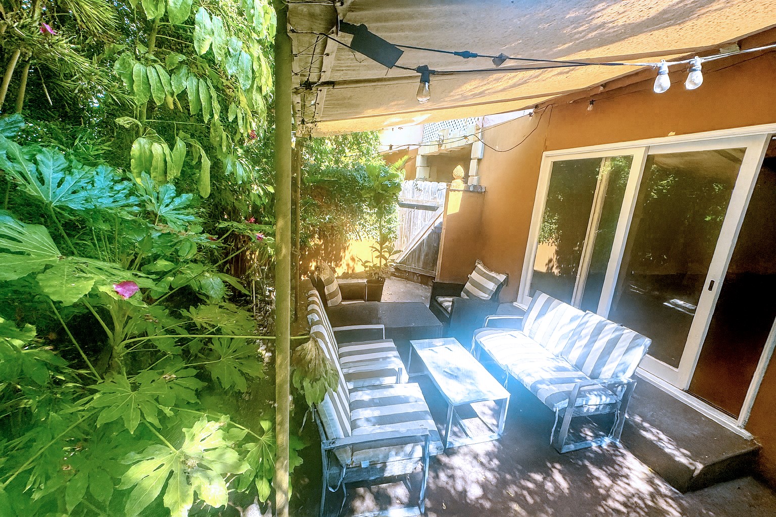 The home features a bright, open layout with air conditioning, a full kitchen with a dishwasher, and a private entrance for added convenience. Enjoy your own private patio, or relax in the building’s lush common courtyard, complete with a koi pond and turtles—a true tropical oasis in the middle of the city.