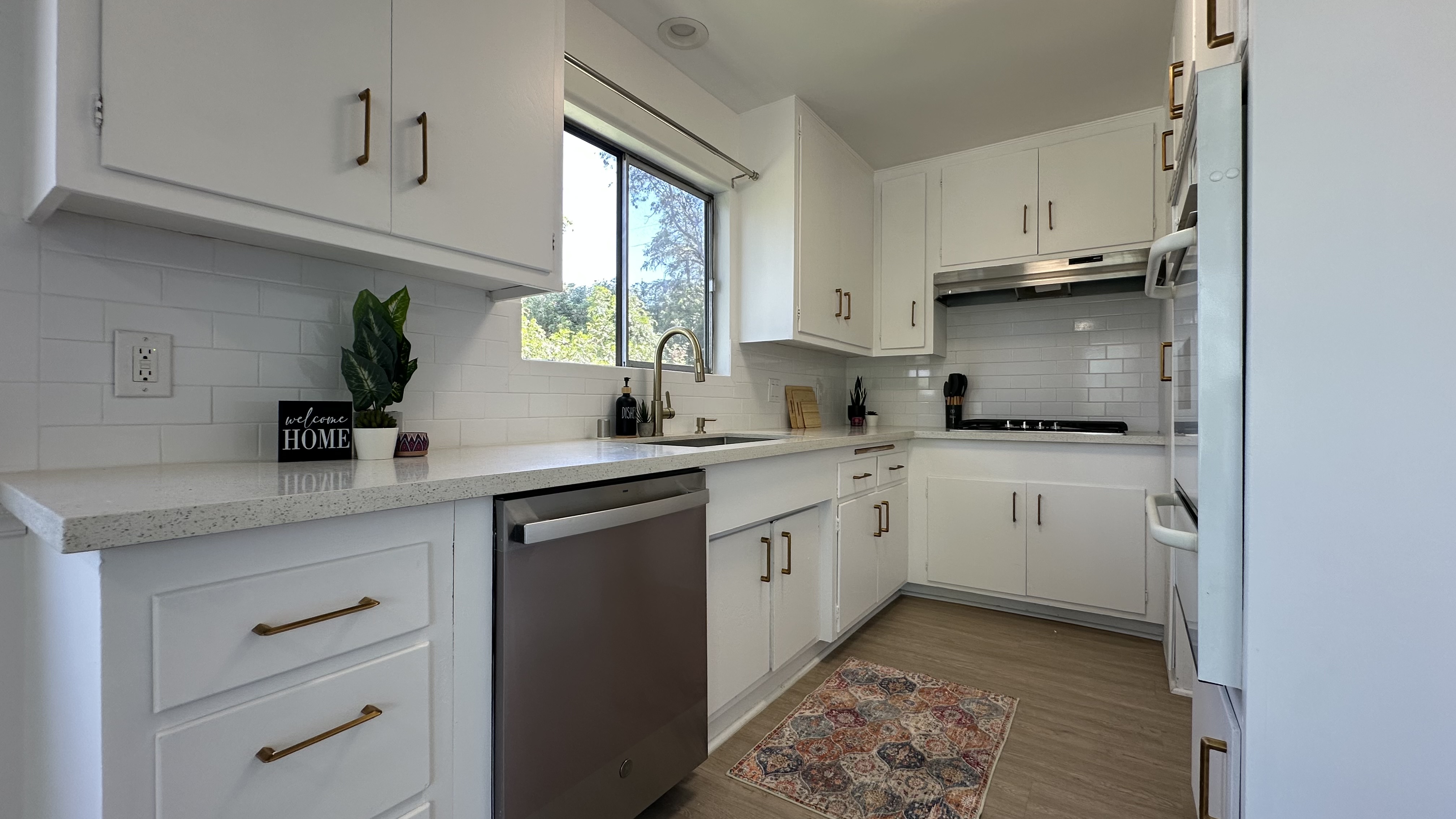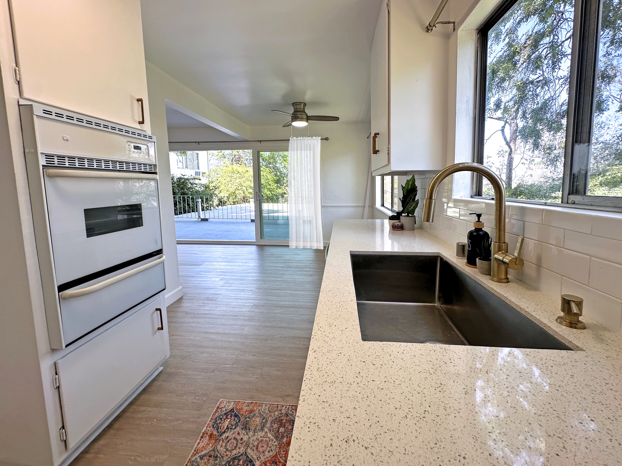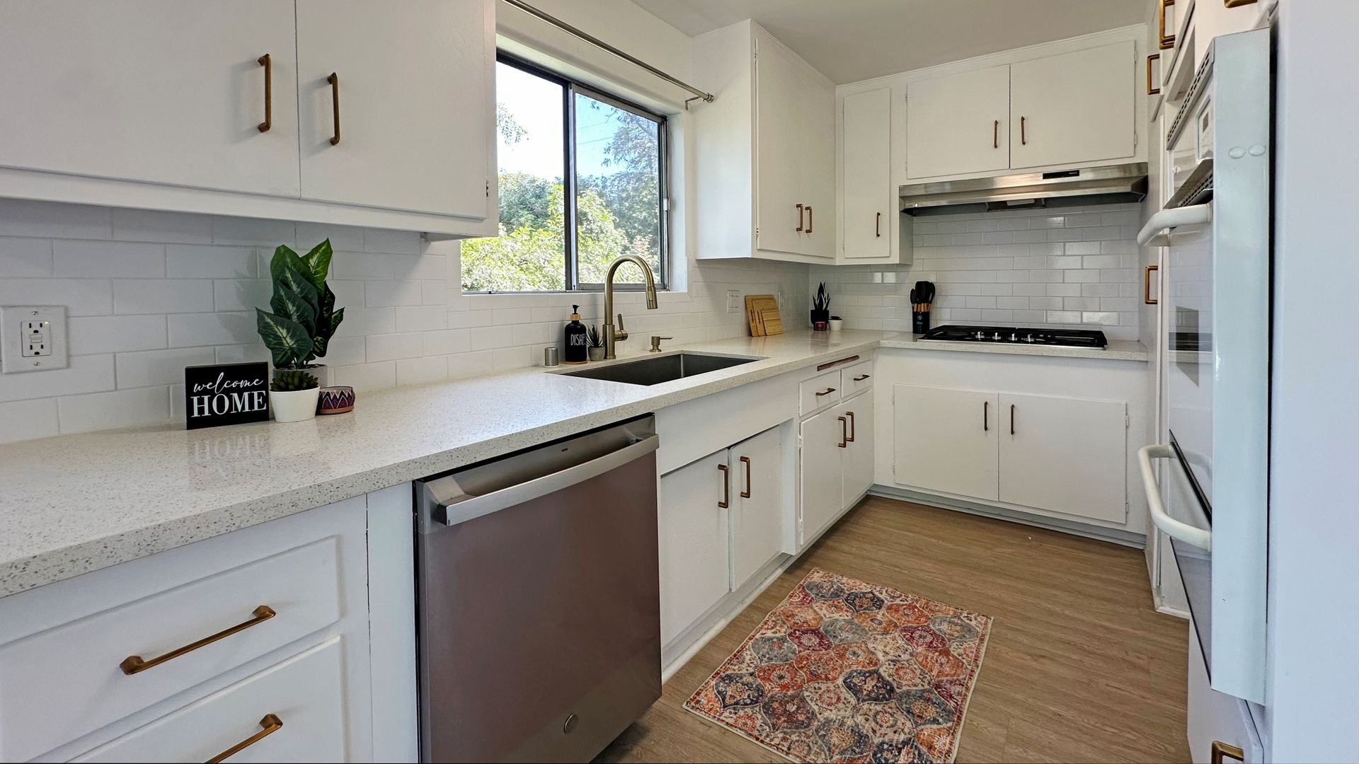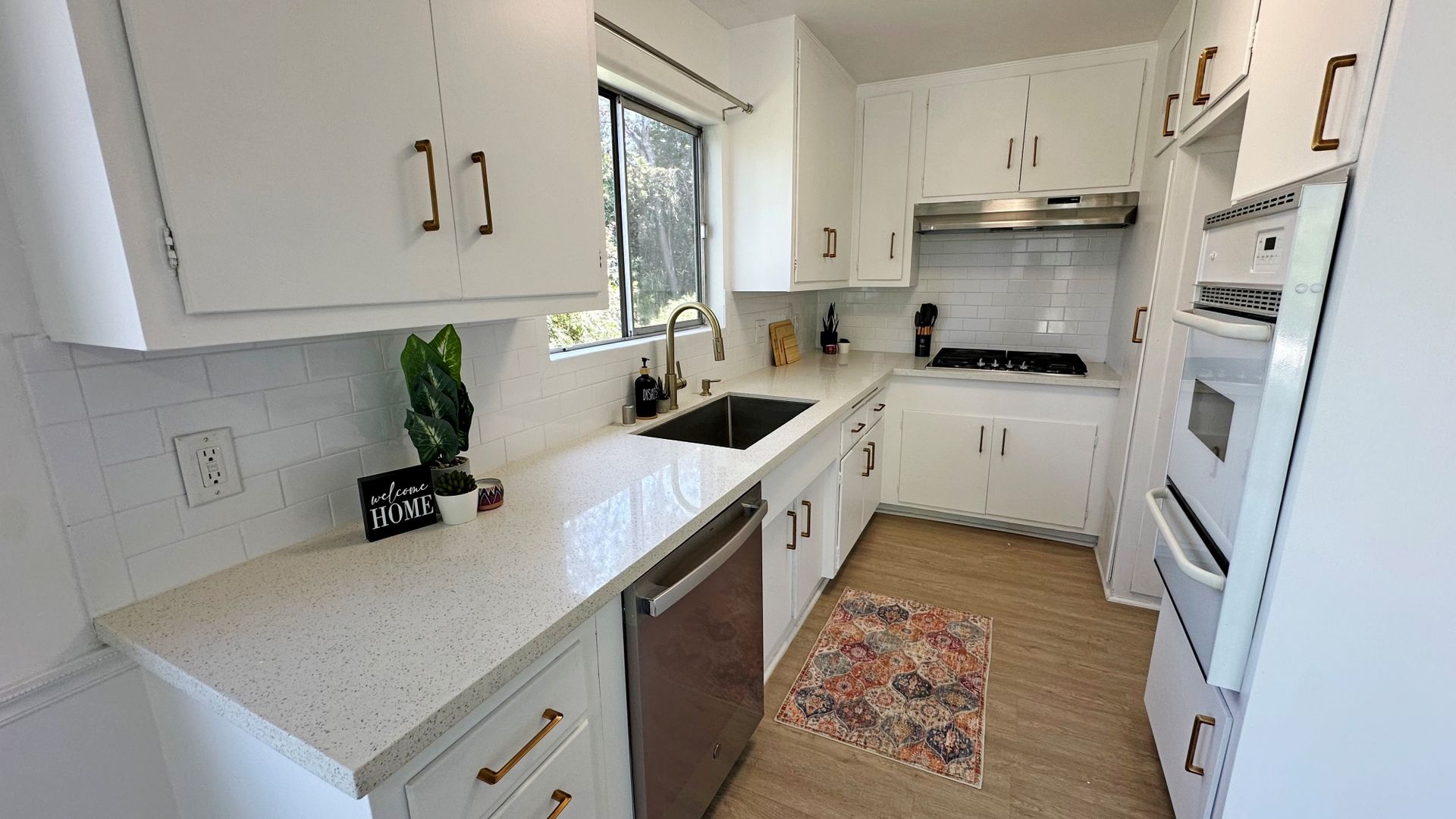 -newly remodeled kitchen; quartz kitchen counter-top & stainless steel sink