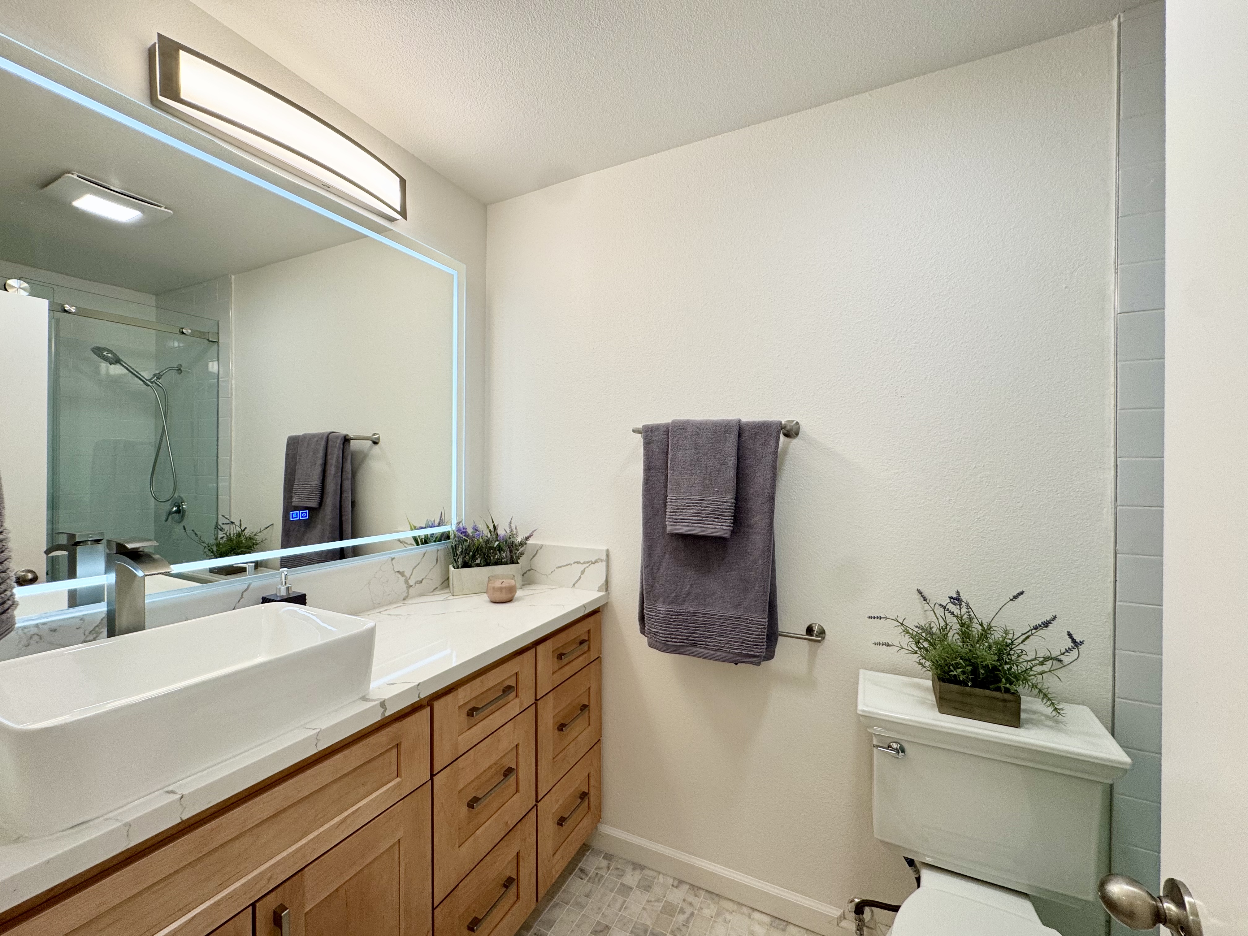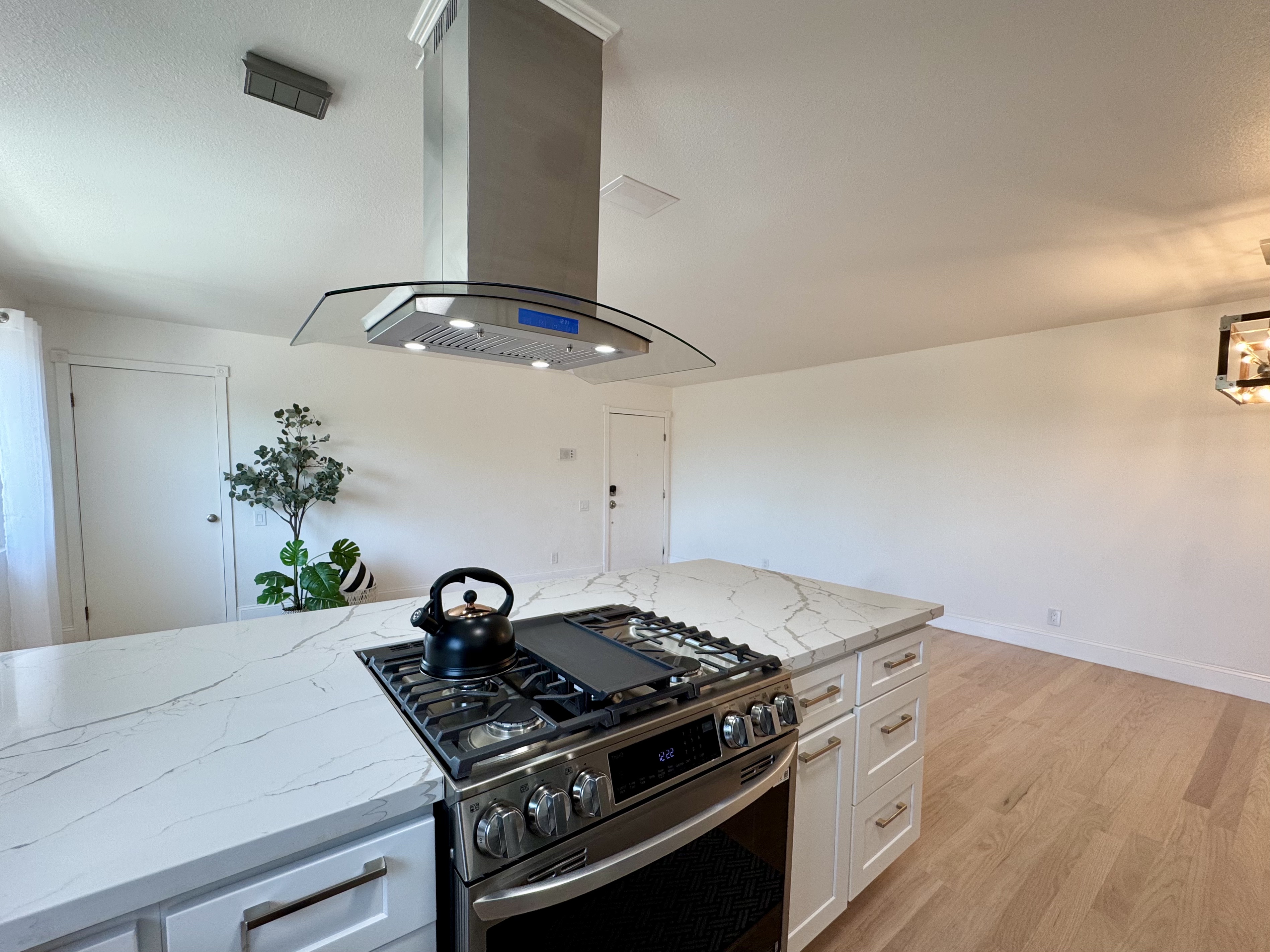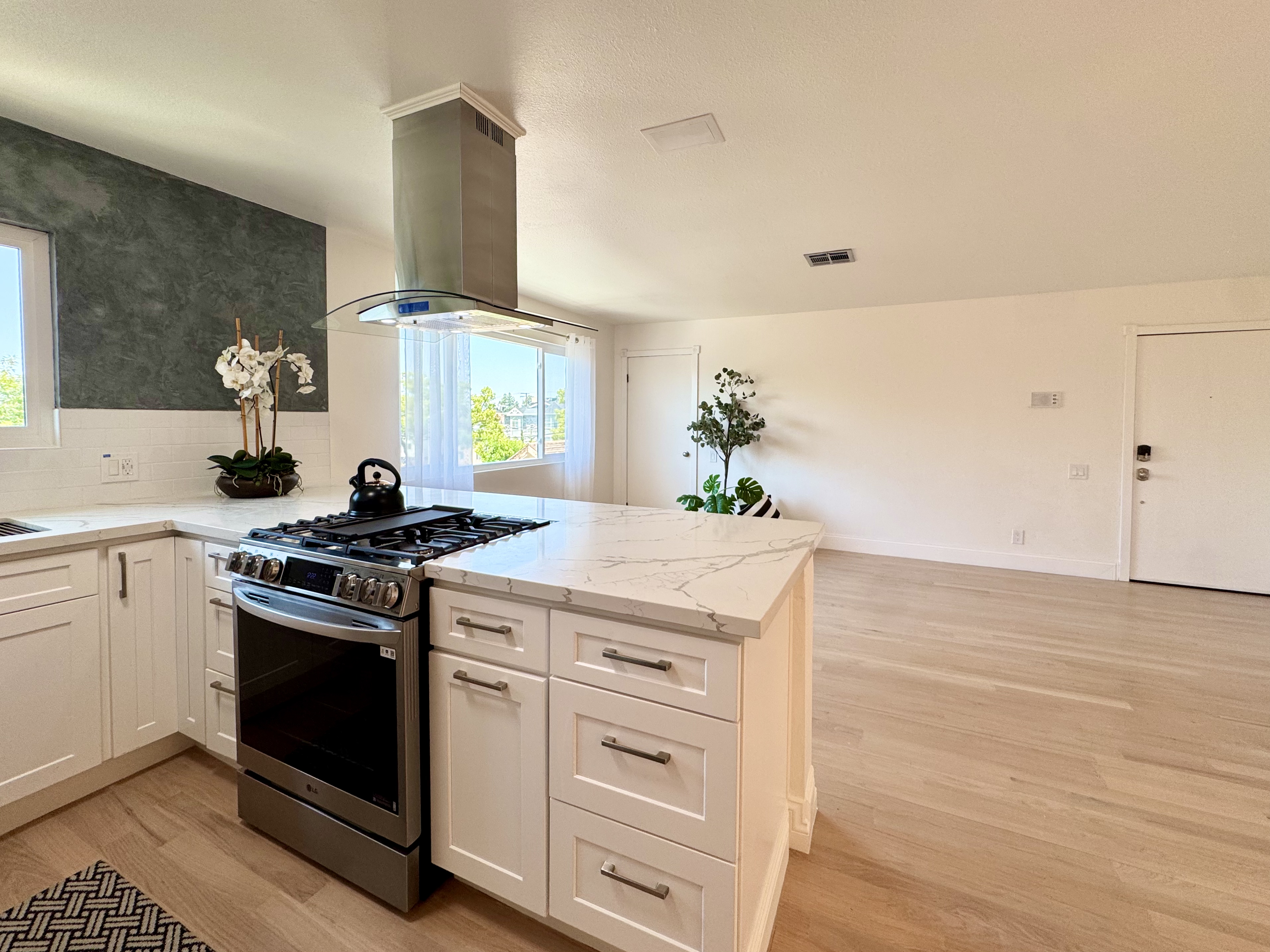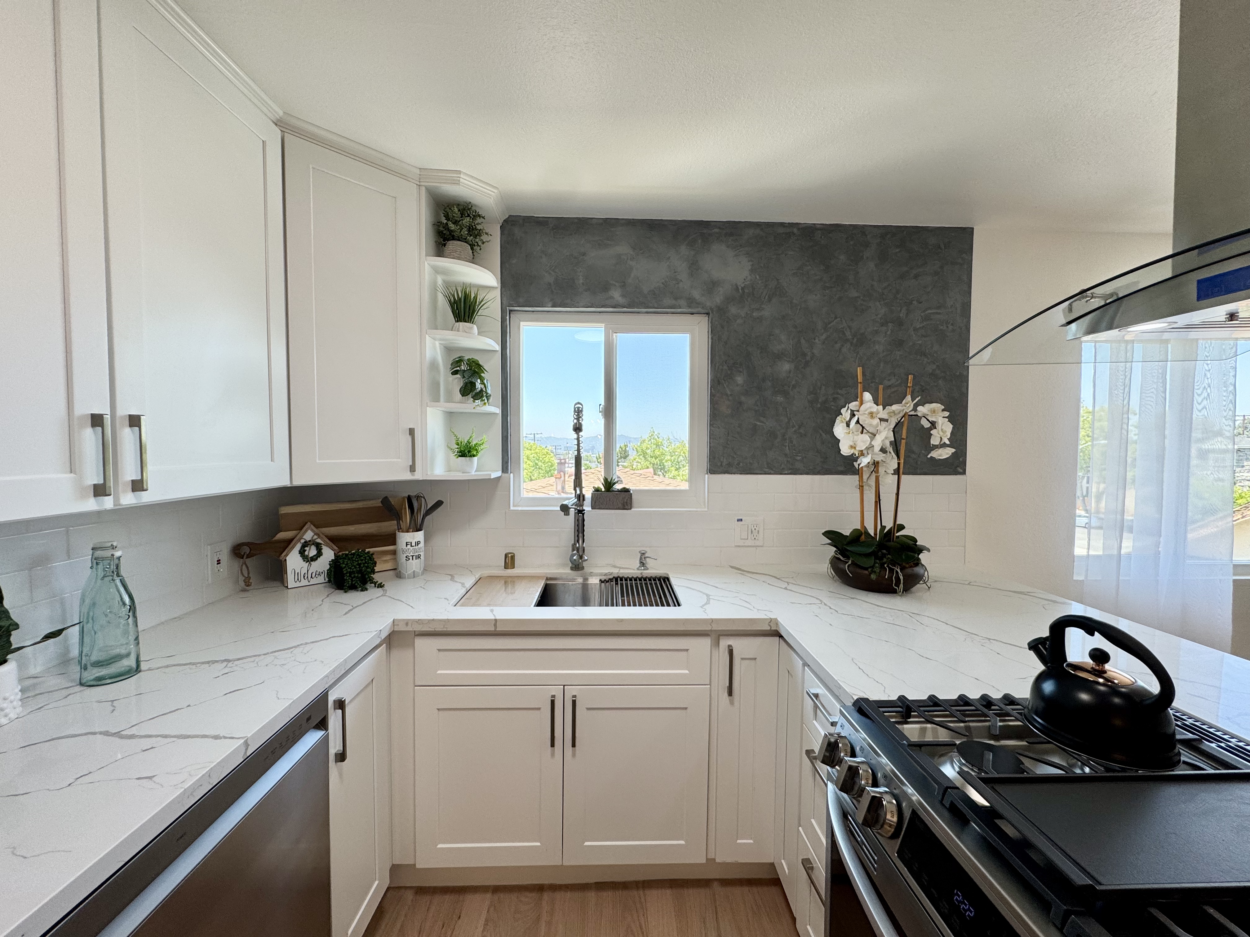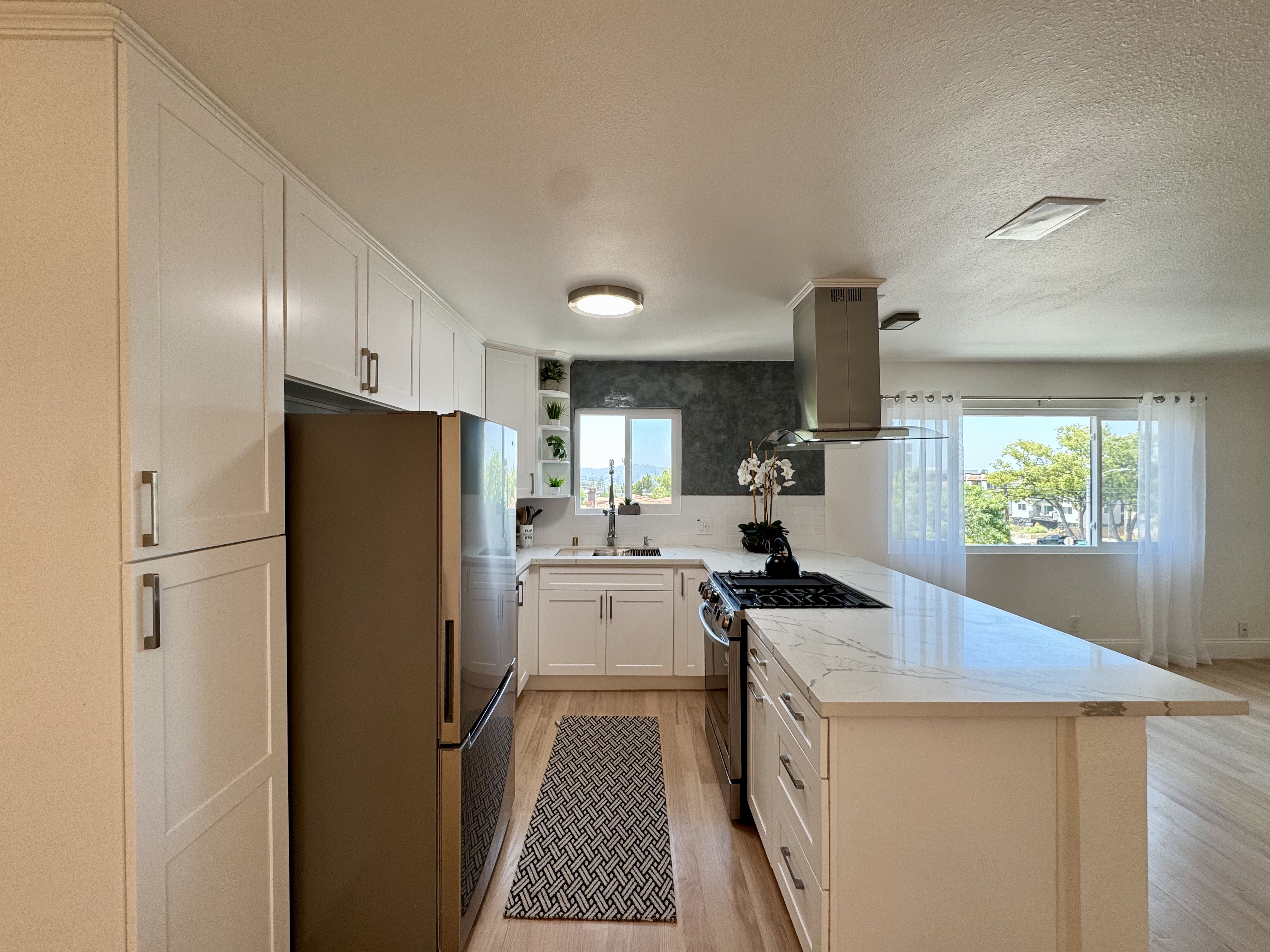-Modern kitchen with stainless steel appliances, quartz countertops